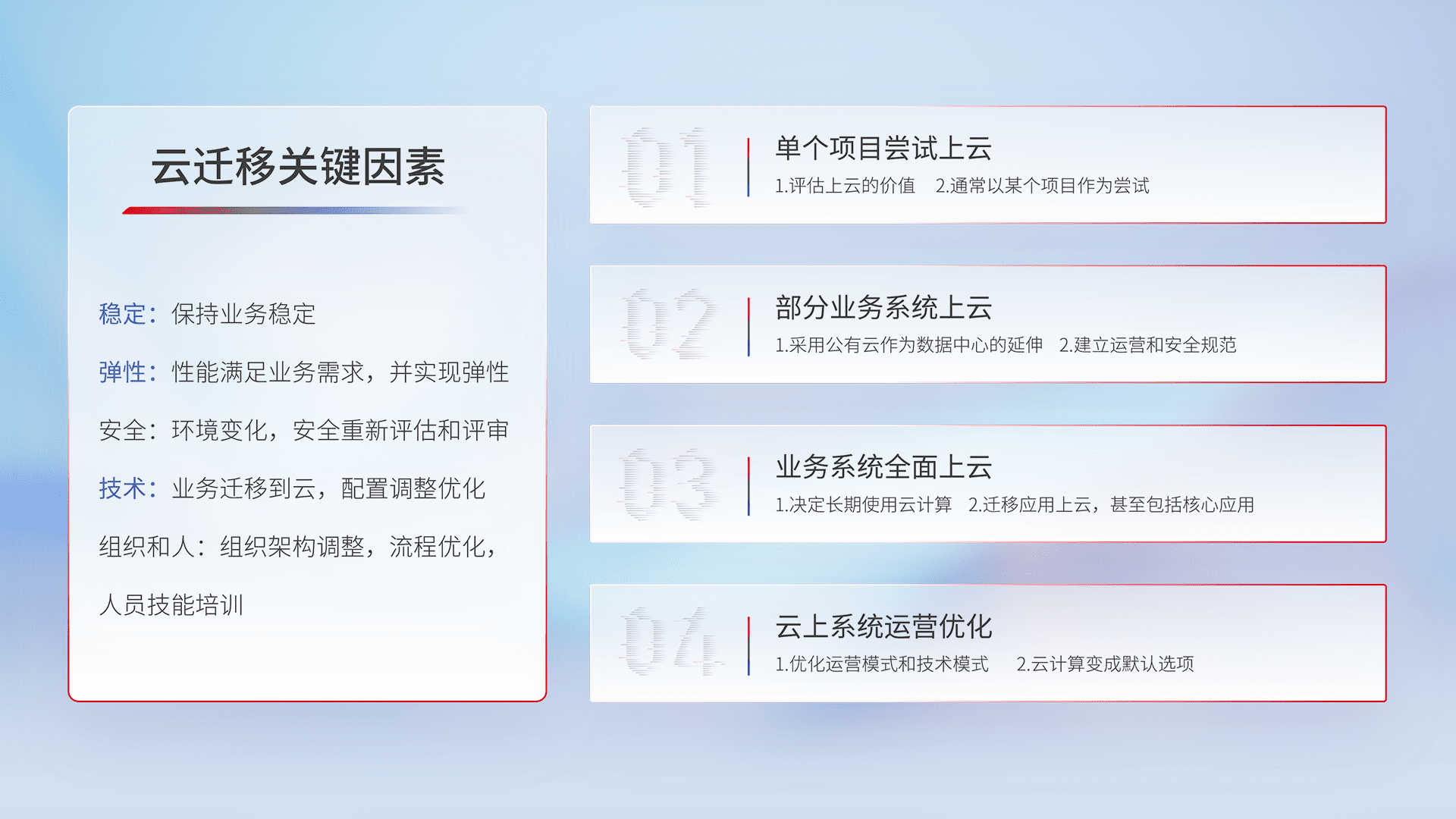 结合实际业务,,从规划设计、、、云平台选型、、、、云原生改造、、数据迁移、、集成交付,,迁移全过程为客户识别最佳上云路径,,,做好风险识别管理,,,,设计网络架构、、、身份权限、、安全审计合规、、、、操作审计、、、日志审计、、、、监控告警策略、、、、多站点容灾设计等,,对云上基础设施进行整体规划,,,提升IT治理水平,,,,以满足弹性、、、、高可用、、、高性能的需求。。